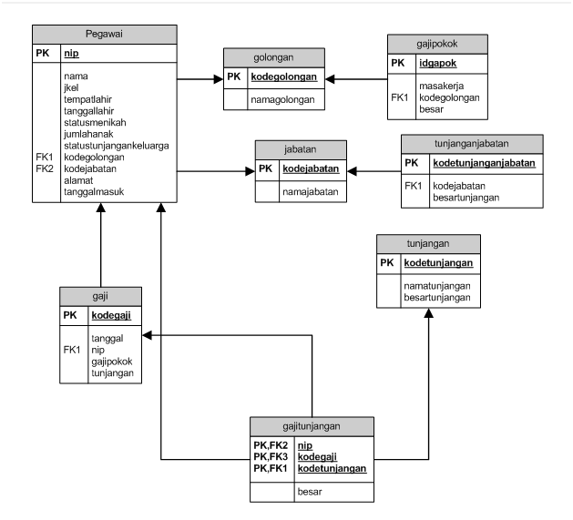 Contoh ERD Sistem Penggajian Karyawan | Kelas Programmer from kelasprogrammer.com Contoh ketika uu bpjs baru saja diterapkan, tentu sistem penggajian tersebut harus menyesuaikan aturan terbaru. Untuk membantu proses belajar, berikut kami lampirkan contoh database karyawan dan penggajian. Suatu system terdiri dari sejumlah komponen yang saling berinteraksi, yang artinya saling bekerja sama membentuk. Open system sistem yang mengalami pertukaran energi, materi atau informasi dengan lingkungannya. Olivia ridheta november 13, 2018 1 comment. Kali ini saya membagikan contoh erd sistem penggajian karyawan sederhana sebagai contoh bahan belajar merancang model basis data. Contoh soal excel (sum, average, max, min) dalam sistem penggajian dalam contoh soal excel kali ini adalah penggunaan perkalian, pengurangan, penjumlahan. Masuknya sistem teknologi informasi ke indonesia merupakan era baru dalam dunia komputerisasi.